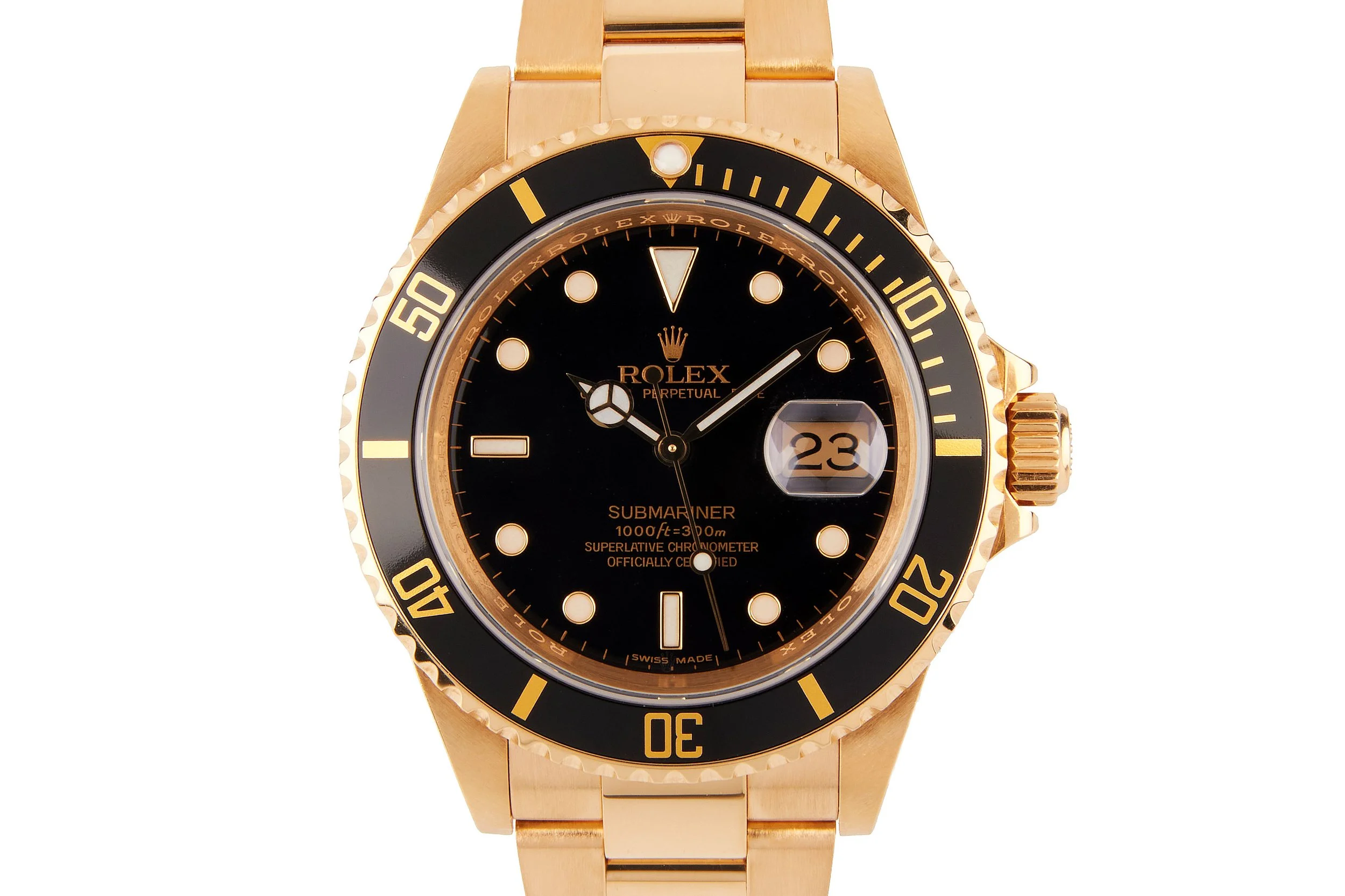 This is a very rare new old stock example of the Rolex Submariner ref. 16618LN, which will be appreciated by any collector. Presented in completely unworn condition, it spent almost two decades in the safe of an authorised dealer, being sold for the very first time in 2021. Made of 18kt yellow gold, it features a black dial and a matching black aluminium bezel that slightly dresses down its aesthetic.