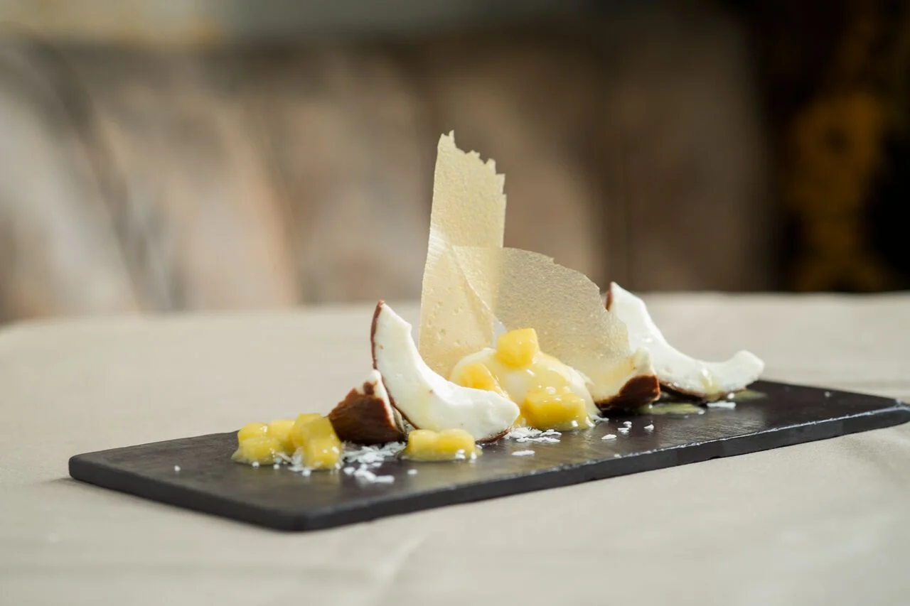 A delicate dessert and the perfect finishing touch to your meal: Coconut mousse, pineapple sorbet, lime and coconut granite.