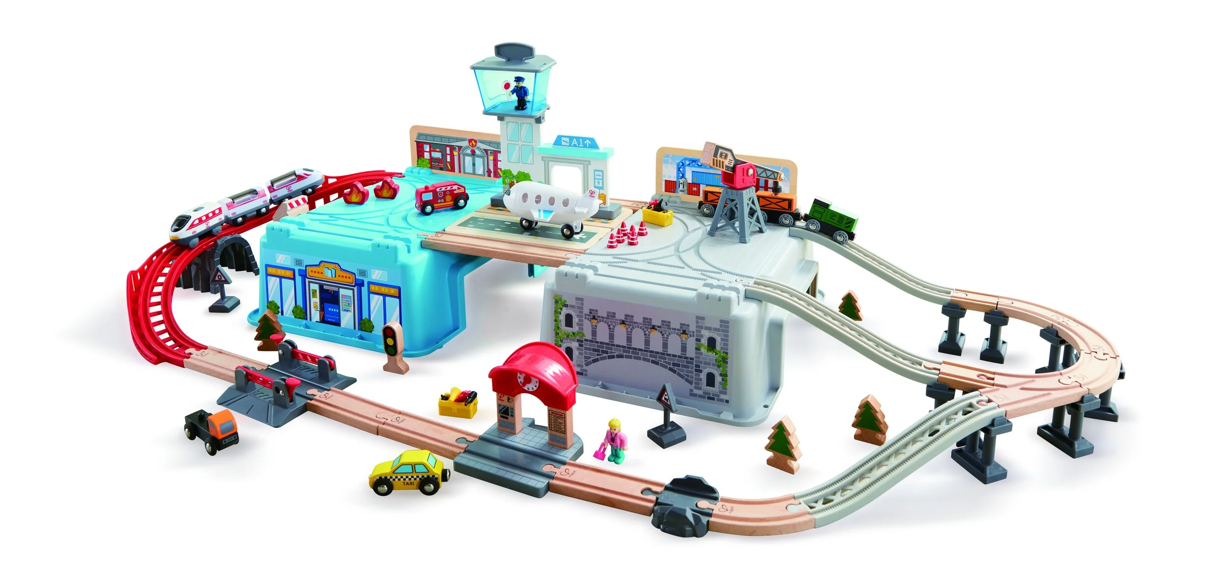 The possibilities are limitless with this dynamic 80-piece wooden metropolis set! Connect scenery with bridges and rails, play with the restaurant, shops, construction site, fire station and airport, and populate the world with people and vehicles! Create endless play scenarios – a fun educational railway set for imaginative play!