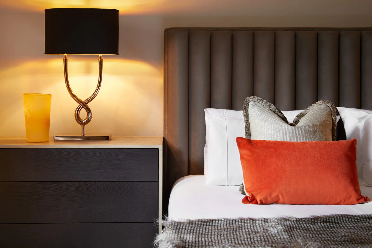 The bedroom was dull and uninteresting but a few carefully-chosen pieces of luxury furniture, some fabulous lighting, tantalising textiles, and – quite simply – a feature bed, made all the difference.